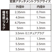 ・接続する機器の外部電源端子に合うアタッチメントプラグを選び、接続する機器の極性と同一になるようにプラグを差し込んでください。