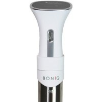 簡単3ステップで安価な赤身のブロック肉やパサつきがちな鶏胸肉を、あなたの想像する理想の肉へと調理する新感覚の画期的調理器具。自宅で放ったらかしで誰がやってもこのローストポークの様な仕上がりを可能にするのがこの調理器の実力です。自宅の食事がいつでも完璧な仕上がりになります。 ●美味しいお肉の状態 55度から58度辺りがもっともお肉が柔らかくなります。この温度帯を意図的に狙う事が「低温調理」なのです。 ●旨味を逃さない方法 肉汁が流出しない温度で調理をするからumamiも残ったまま。 ●端から端まで全部ミディアムレア 低温調理は、端から端までが全く同じ焼き具合が可能。 ●絶対温度で火入れをする 誰でも簡単に狙った温度で調理をするにはどうれば良いでしょうか?270度に熱せられたフライパンを使って、58度の焼き加減でお肉を調理するのは至難の業です。家庭でステーキを焼いても美味しく出来上がらないのがその理由です。空気を抜いて湯煎をする事で、熱が空気中で減衰する事なく設定した温度で全体を包む様にムラなく調理する事が出来ます。BONIQを使えば0.5度の単位で任意の調理温度が設定出来ます。例えば、58.5度で調理するという事も可能です後は、スタートボタンを押して1時間程放置すれば出来上がり!! ■STEP1・・・下味付け お好みの調味料で下味を付けて、フリーザーバッグに入れる ■STEP2・・・調理 時間と温度を設定し、食材を入れてスイッチオン! ■STEP3・・・仕上げ 香ばしさが出る程度に表面に焼き目を入れたら完成!! 仕 様 ●定格電力:100v / 50-60hz(最大800w) ●温度範囲:5℃〜100℃(温度誤差 +/-1%) ●設定時間:1分〜99時間59分 ●湯煎容量:容量5〜15リットルの鍋 ●製品サイズ:高さ37cm / 最大幅10cm / 最小幅 6cm ●製品重量:1.2kg ●電源コードの長さ:1.5m ●メーカー保証:1年間