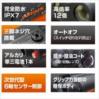 シリウス12 「トウェルブ」は独自ジャイロセンサーを搭載した12倍、完全防水の日本製防振双眼鏡。揺れる環境下でピタリと目標物を確認できる。三脚ネジ穴やオート電源オフ機能、グリップ感抜群の小型設計などきめ細かなアイデアが組み込まれている。