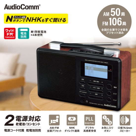 OHM オーム電機 AudioComm Nラジオ 周波数合わせ不要 AM/FM/ワイドFM対応 2電源 簡単選局